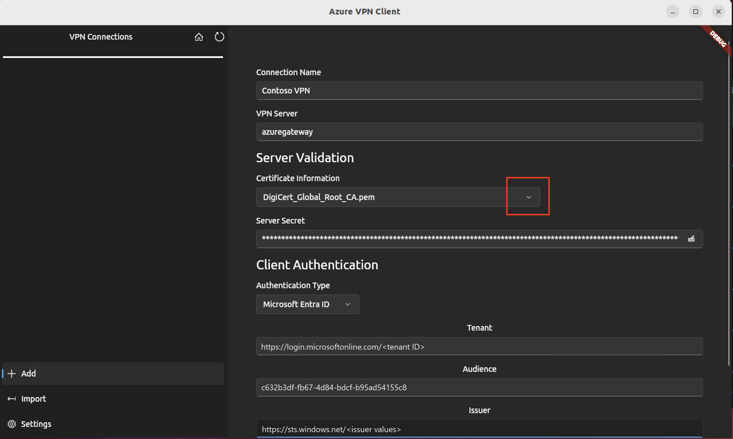 View the connection profile information. Change the Certificate Information value to show the default DigiCert_Global_Root G2.pem or DigiCert_Global_Root_CA.pem. Don't leave blank.