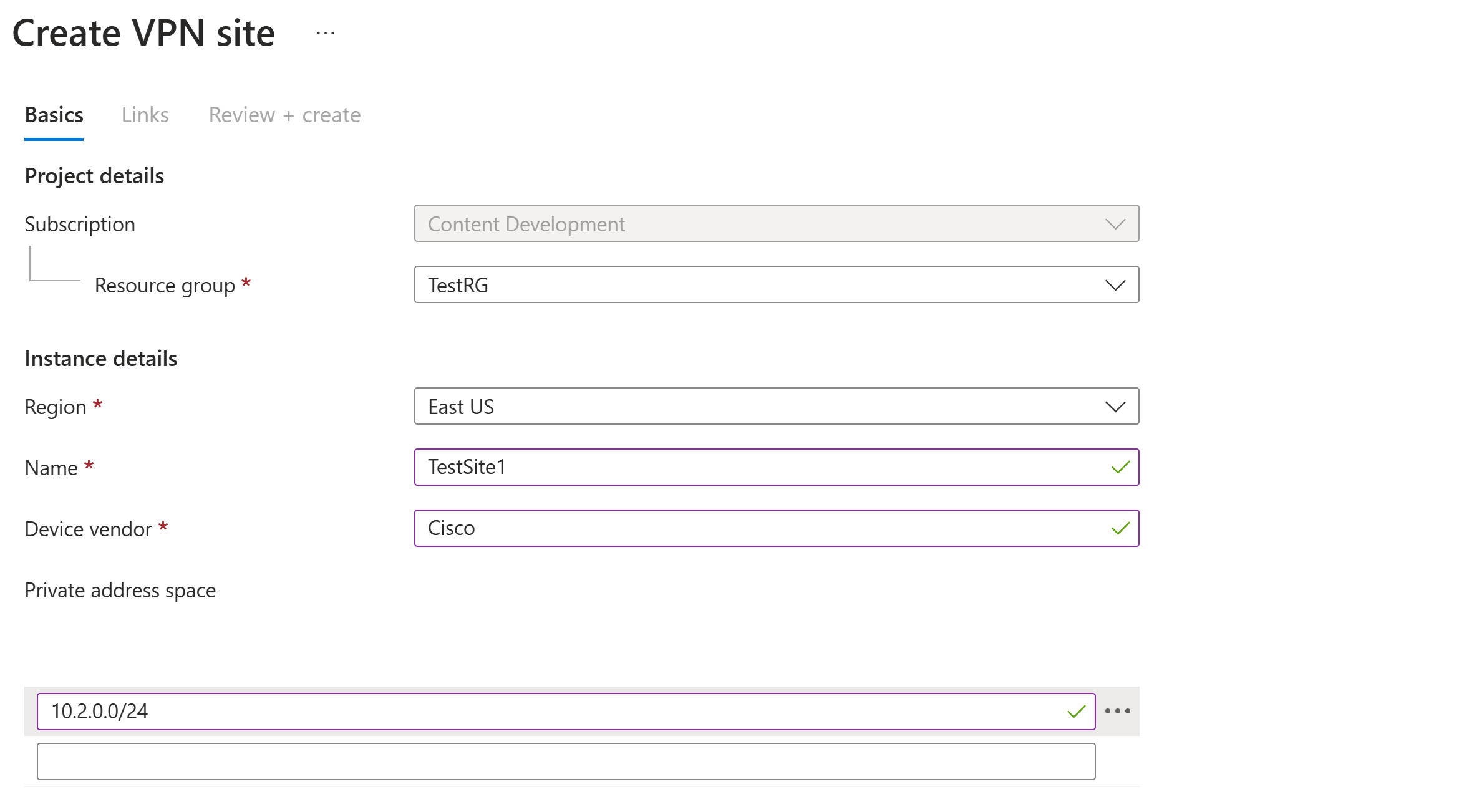 On the Create VPN Site page, on the Basics tab, complete the following fields: