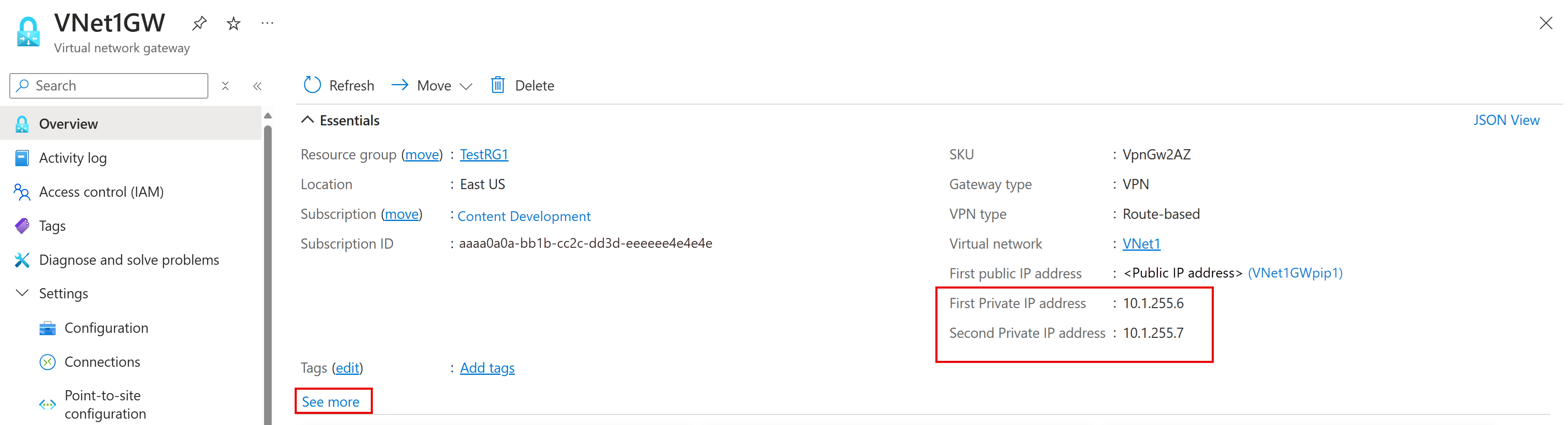 On the Overview page, select See More to view the private IP address. Write down this information to use later in the configuration steps. If you have an active-active mode VPN gateway, you'll see two private IP addresses.