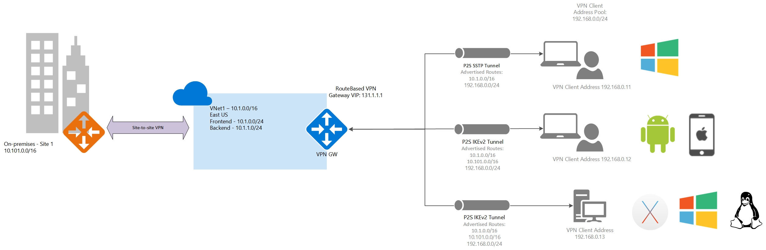 Routes added to Windows clients: 10.1.0.0/16, 192.168.0.0/24