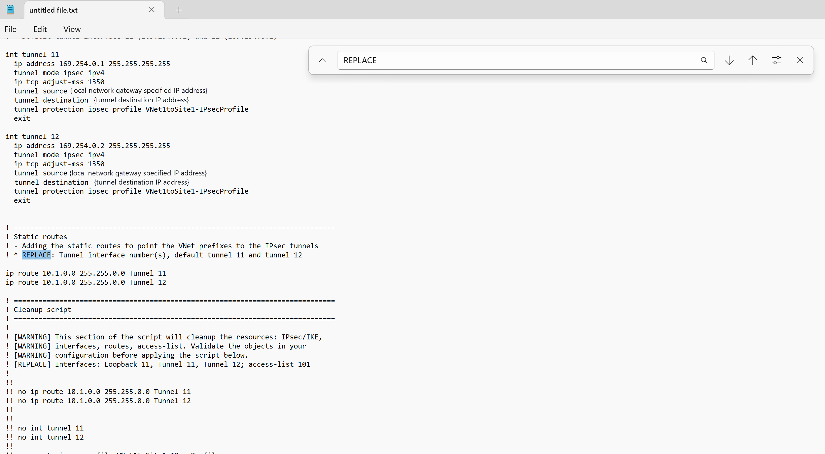Open the configuration script with a text editor and search for the keyword "REPLACE" to identify and examine the parameters that might need to be replaced before applying the script to your VPN device.