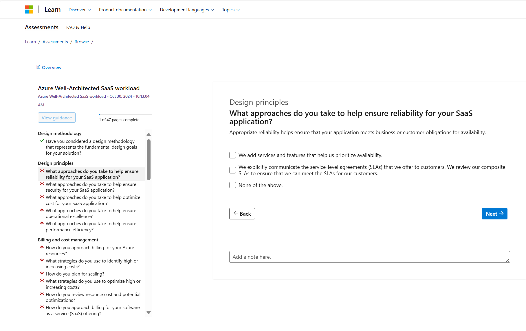 These questions help you benchmark your workload's maturity and alignment compared to the recommended approach for operating an Azure SaaS workload. The assessment's final guidance provides technical recommendations and documentation about how to implement a highly reliable SaaS solution on Azure.