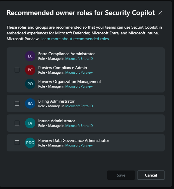 You can update the set of Security Copilot at any time. The list of recommended roles includes Microsoft Entra ID roles and some service specific roles, like Microsoft Purview roles and Microsoft Defender roles.