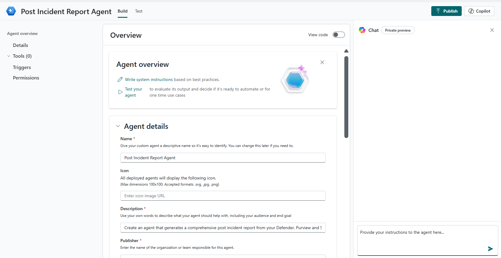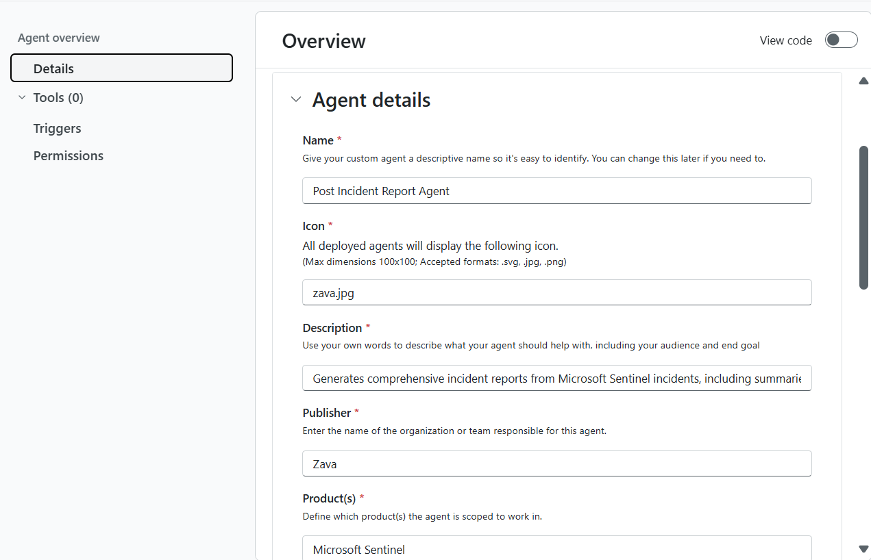 Use the Overview page to specify your agent’s purpose and scope, tools to execute tasks, triggers, and permissions.