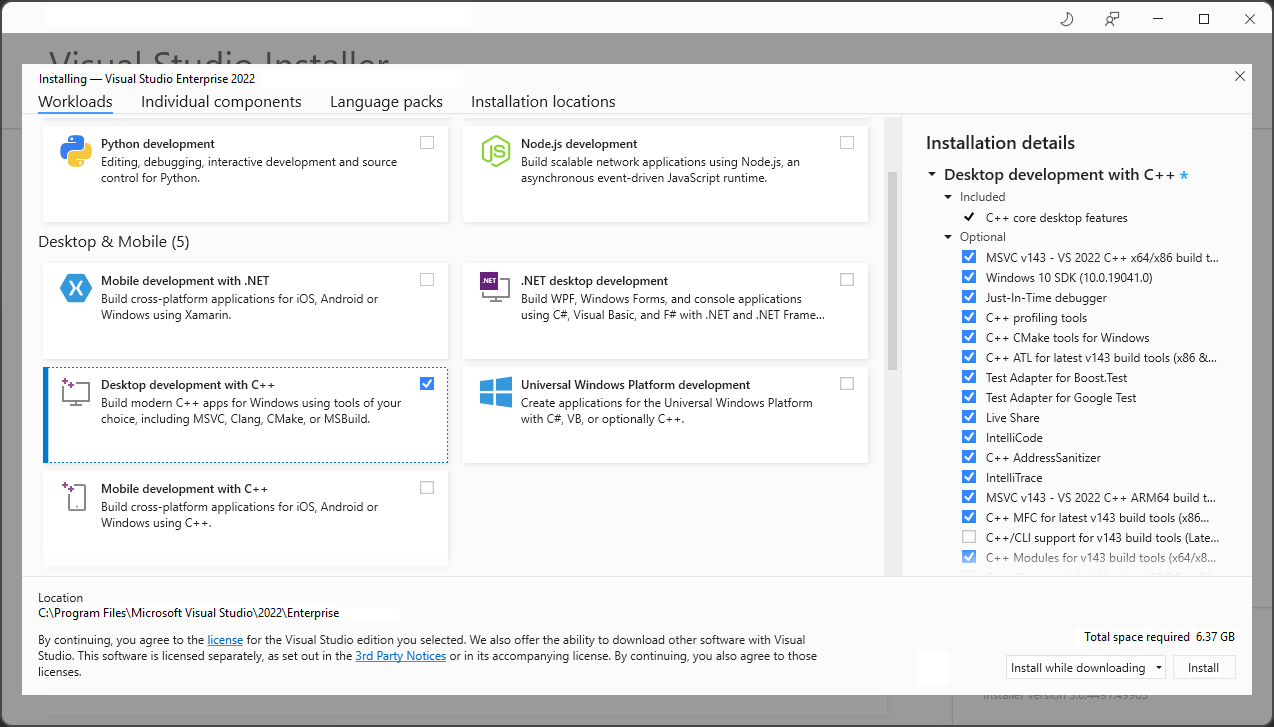 For C and C++, select the Desktop development with C++ workload and then choose Install.