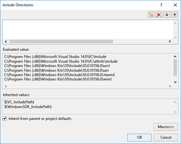 This action changes the values of project macros that include paths to header files and library files. To see what changed, open the Visual C++ Directories section of the Project Properties dialog. Select one of the properties, such as Include Directories. Then, open the property value's dropdown list, and choose <Edit>. The Include Directories dialog appears.