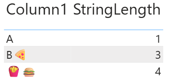 Here’s a before and after comparison of the result of StringLength on a column that contains Unicode characters: