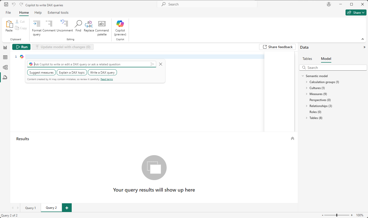 - Copilot to help write DAX queries is contained in the privacy, security, and responsible use of Copilot in Fabric.