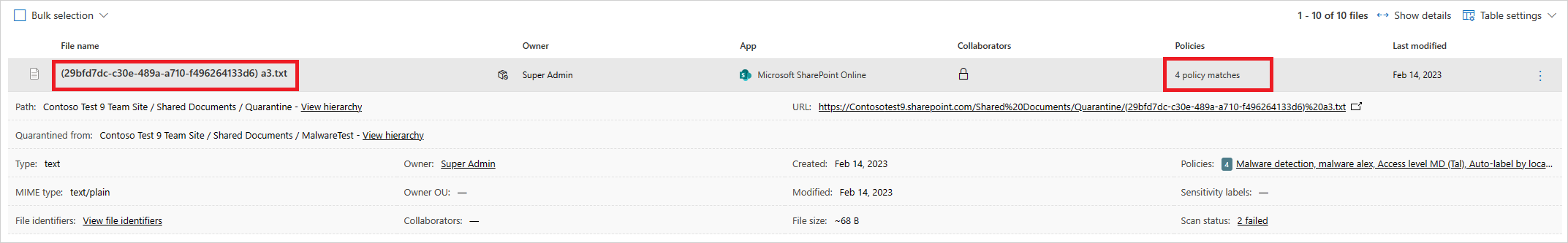 Quarantined – If the file quarantined by the service. For example, show me all files that are quarantined.