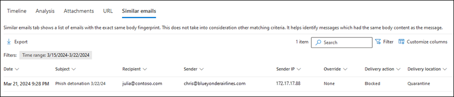 The Similar emails view shows other email messages that have the same message body fingerprint as this message. Matching criteria in other messages doesn't apply for this view (for example, file attachment fingerprints).