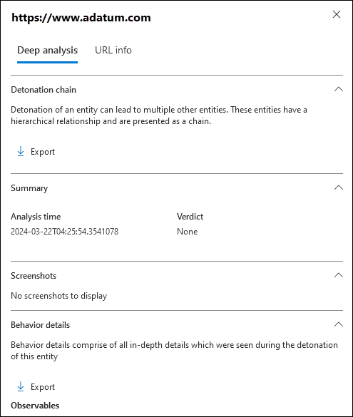 - Deep analysis tab: Information is available on this tab if Safe Links scanned (detonated) the URL and it is identified as malicious through detonation. You can identify these messages in Threat Explorer using the following methods: