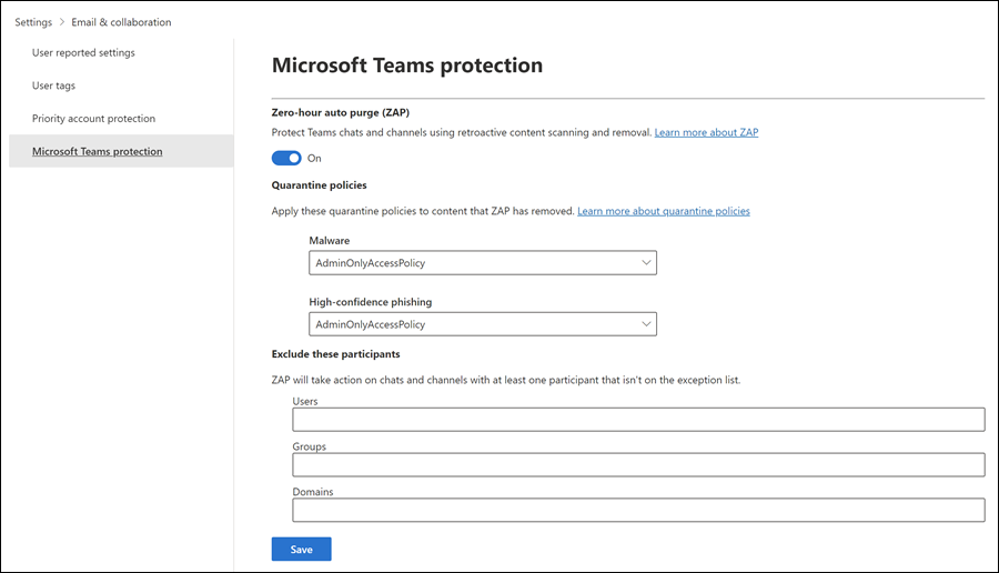 Exclude these participants section: Specify the Users, Groups, or Domains to exclude from ZAP for Teams protection. Exclusions matter for message recipients, not message senders. For more information, see Zero-hour auto purge (ZAP) in Microsoft Teams.