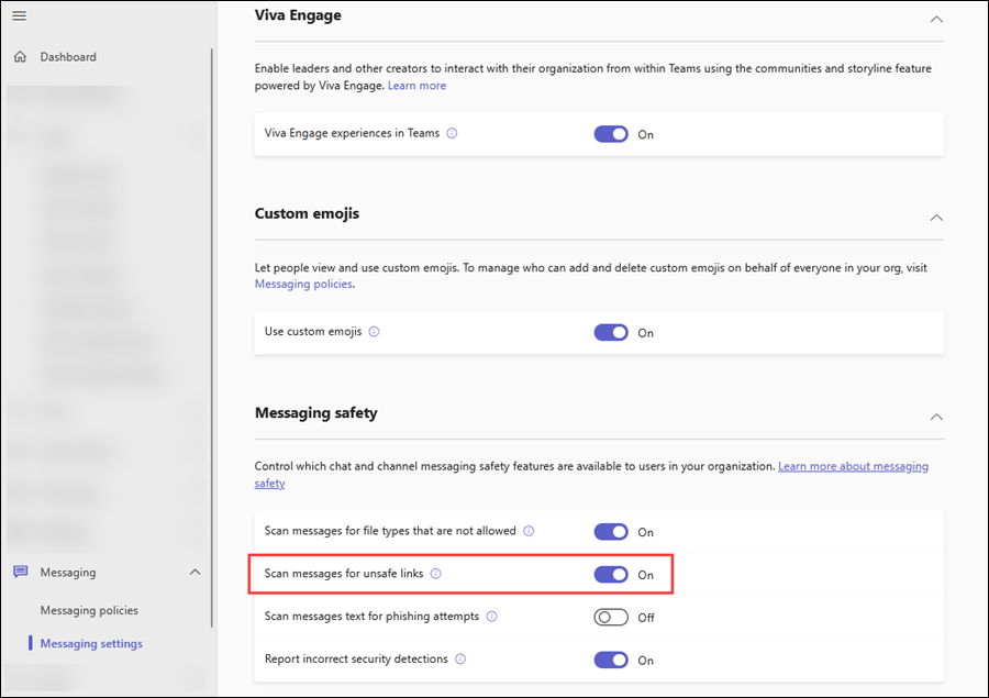 On the Message settings page, go to the Messaging safety section and verify the Scan messages for unsafe links toggle is