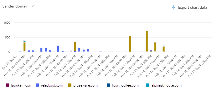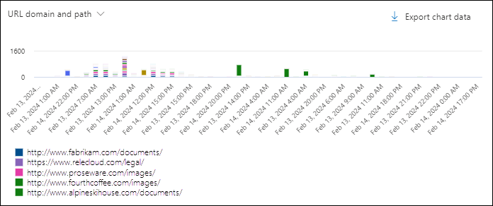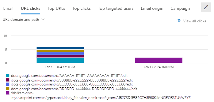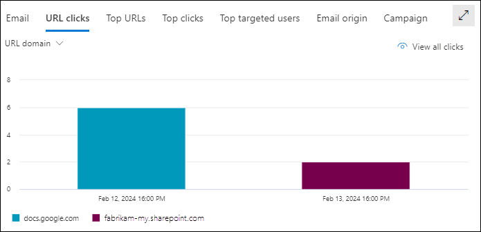 The URL domain pivot organizes the chart by the domains in URLs that users clicked in email, Office files, or Microsoft Teams for the specified date/time range and property filters.