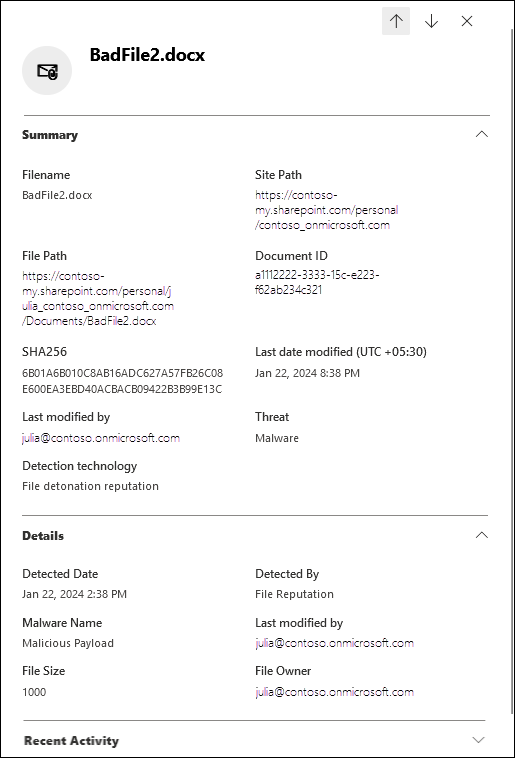 Recent activity: Shows the summarized results of an Audit log search for the recipient: