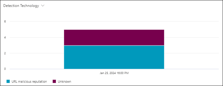 The Detection technology pivot organizes the chart by the feature that identified the URL clicks in email, Office files, or Microsoft Teams for the specified date/time range and property filters.