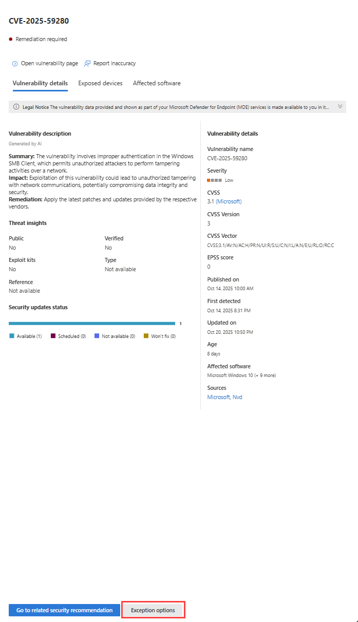 Microsoft Defender Vulnerability Management provides exceptions to help you control what type of data is relevant to your organization and to selectively exclude specific data from your remediation efforts.