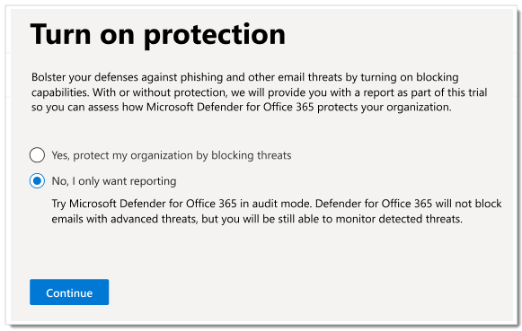 In the Turn on protection dialog, select No, I only want reporting, and then click Continue.
