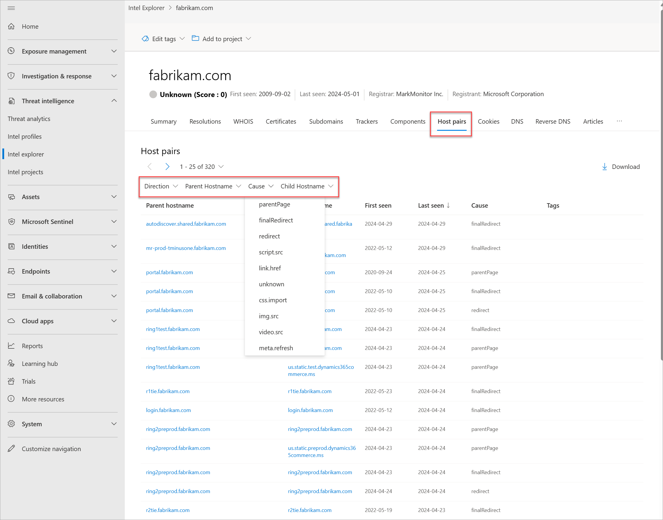 Microsoft Defender Threat Intelligence (Defender TI) lets you access our vast collection of crawling data in an indexed and pivot table format. These data sets can be large, returning expansive amounts of historic and recent data. By letting you appropriately sort and filter the data, we help you surface the connections of interest easily.