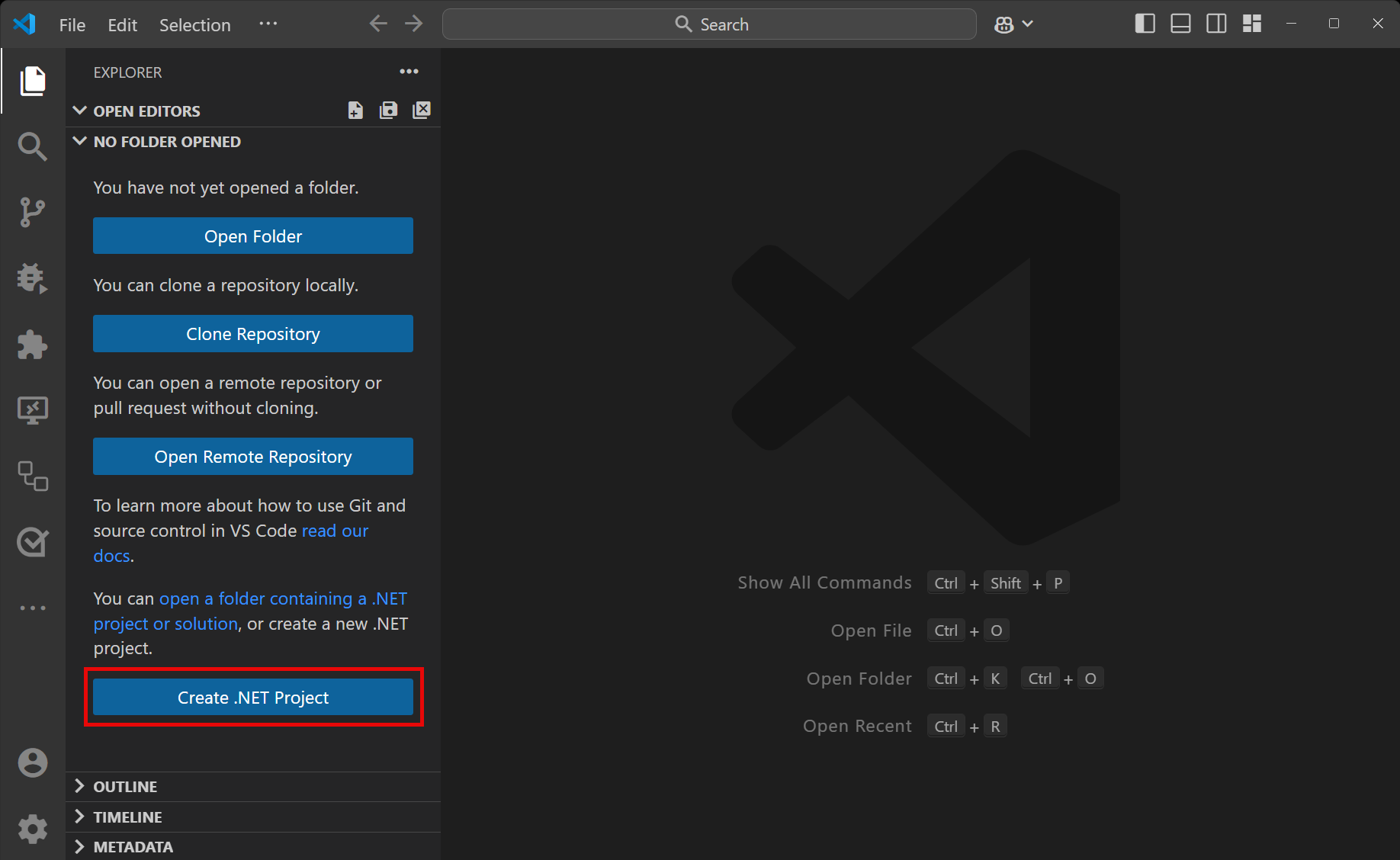 To view the available templates in Visual Studio Code with the C# DevKit installed, select the Create .NET Project button when no folder is opened in the Explorer view: