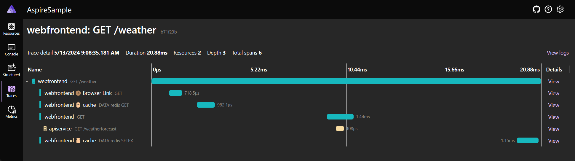 • Traces: Displays the traces for your application, which can track request paths through your apps. Locate a request for /weather and select View on the right side of the page. The dashboard should display the request in stages as it travels through the different parts of your app.