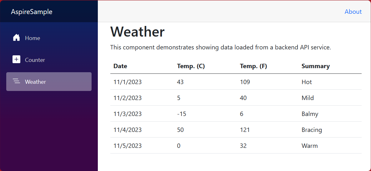 • AspireSample.Web: An ASP.NET Core Blazor App project with default Aspire service configurations, this project depends on the AspireSample.ServiceDefaults project. For more information, see Aspire service defaults.
