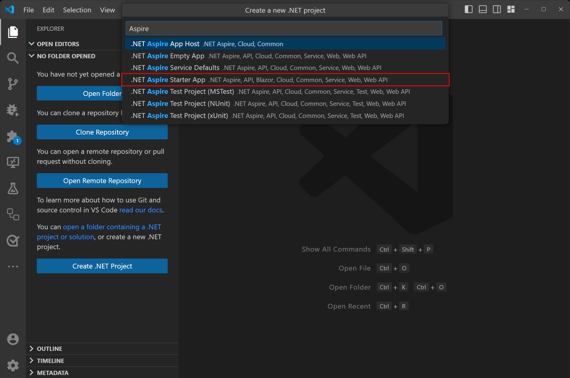 Visual Studio Code provides Aspire project templates that handle some initial setup configurations for you. Complete the following steps to create a project for this quickstart: