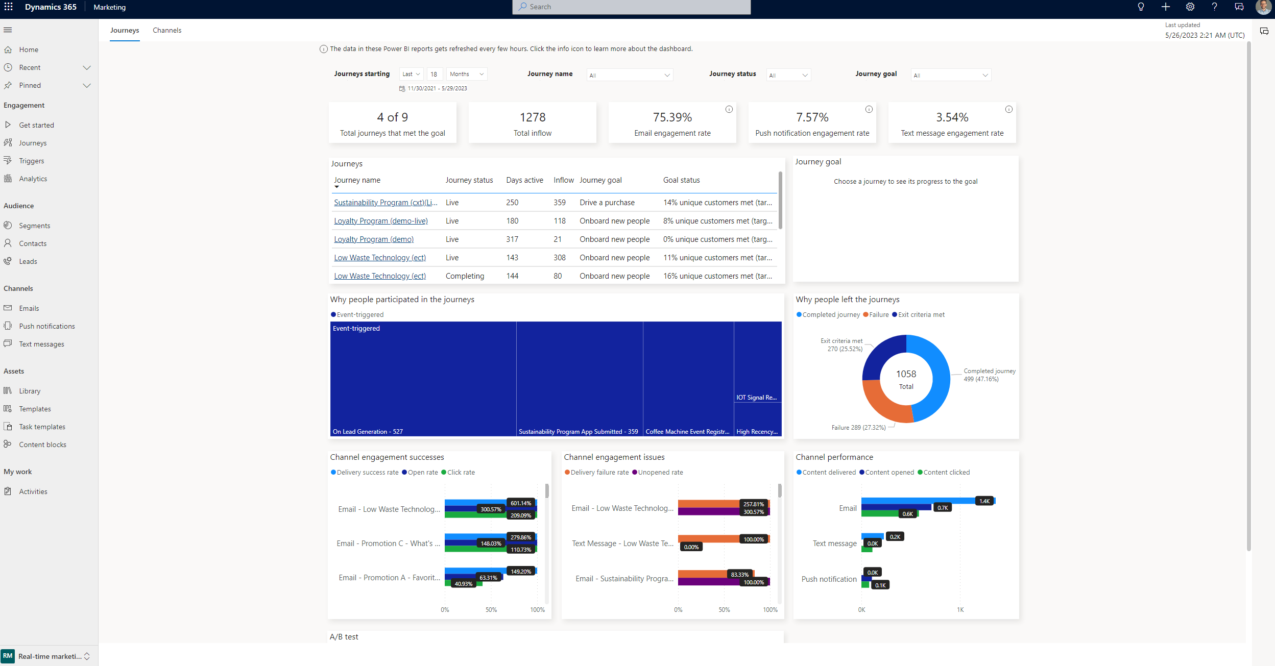 Aggregate cross-journey analytics allow you to analyze your orchestrated journeys and evaluate their performance. Cross-journey analytics address your reporting needs by providing a performance dashboard out of the box with beautiful Power BI visuals. Use the dashboard to enhance stakeholder presentations regarding your journey's performance.