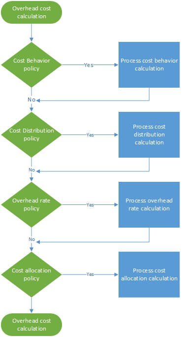 Overhead calculation is run independently of the version. Therefore, you can calculate the Budget version before the Actual version. Overhead calculation consists of four steps, as shown in the following illustration. In each step, a journal header is created that has journal entries. This journal header keeps the input data for each calculation step. Policies and rules are applied to each journal line, and cost entries are generated as output. Therefore, you always have full traceability.
