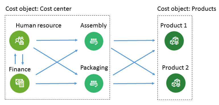 Here is a simple example that explains how you can trace the flow of cost. Cost object CC001 HR contributes to several cost objects. A statistical dimension member that is named HR services is created to measure the consumed magnitude.