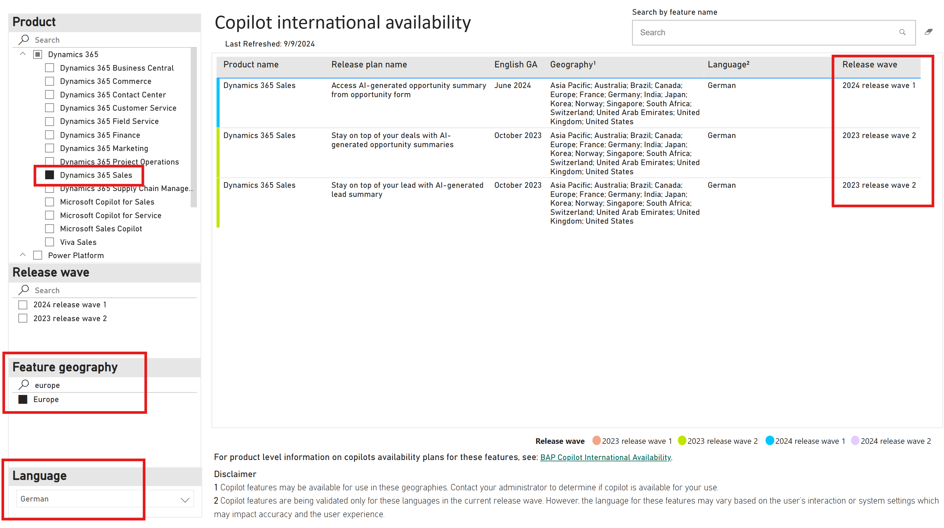 The Copilot international availability report includes information about the availability of Copilot in Dynamics 365 Sales features in different regions and languages.