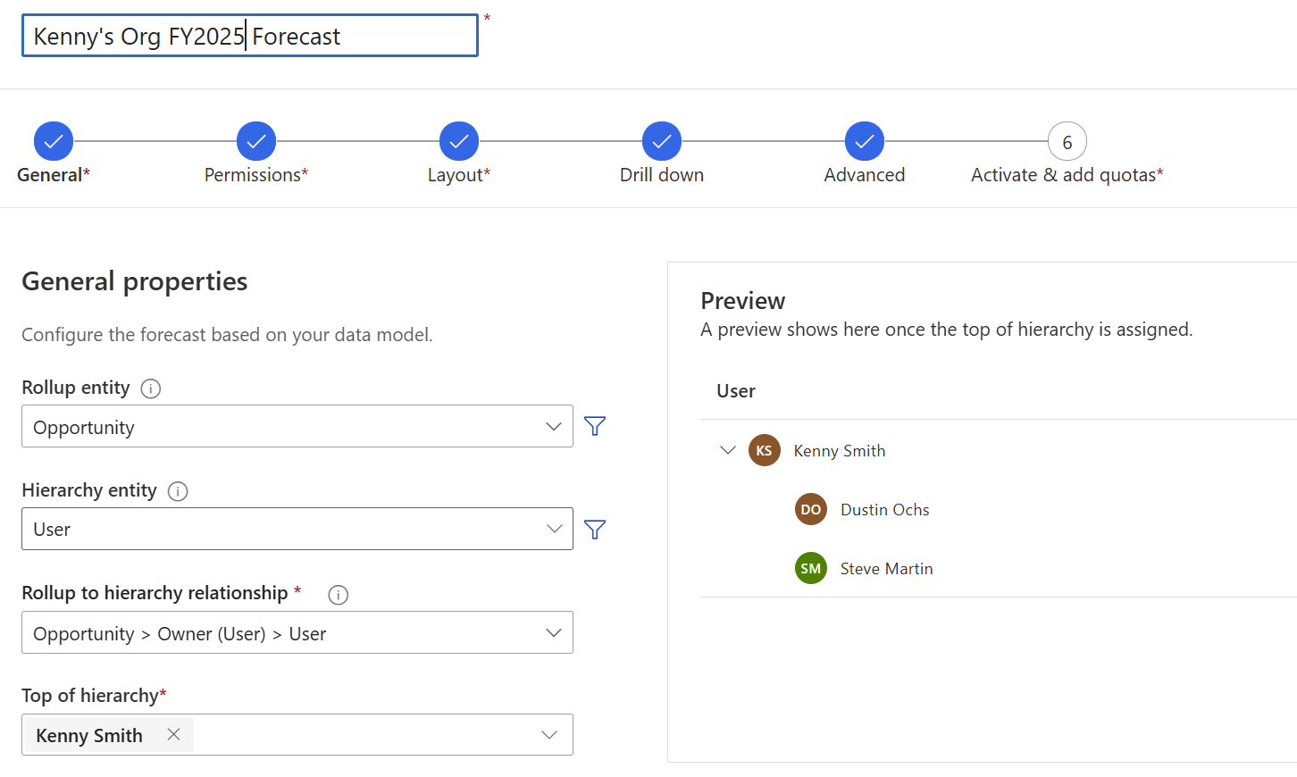 In the General step of the Forecast configuration page, define the fields that should be used for the forecast. The following screenshot is an example of the General step for an org chart forecast. Let's walk through the options in the subsequent steps.