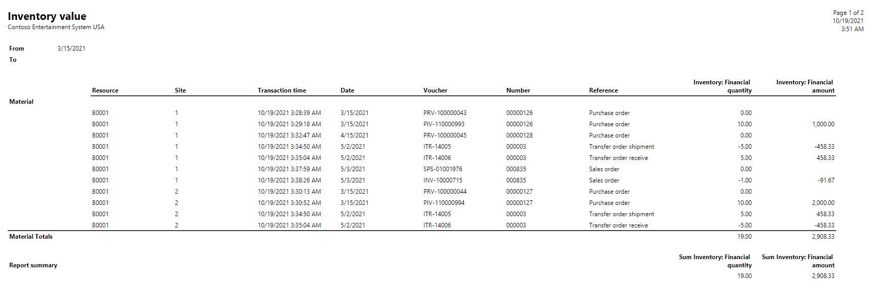 | Material | B0001 | 1 | 3/15/2021 | 00000126 | Purchase order | 0.00 | 0.00 | 10.00 | 1,000.00 | 10.00 | 1,000.00 |