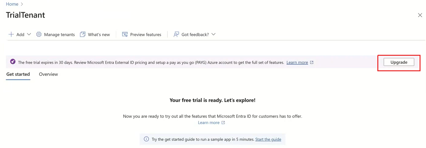 Once your external tenant free trial is ready, the next step is to personalize your customer's sign-in and sign-up experience, set up a user in your tenant, and configure a sample app. The get started guide walks you through all of these steps in just a few minutes. For more information about the next steps, see the get started guide article.