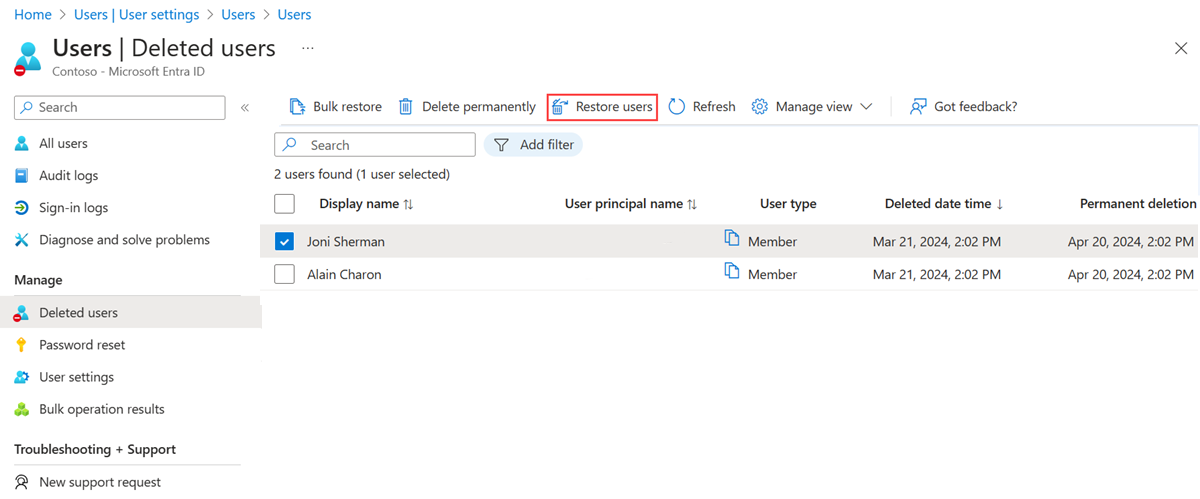 You can view your restorable users, restore a deleted user, or permanently delete a user using the Microsoft Entra admin center.
