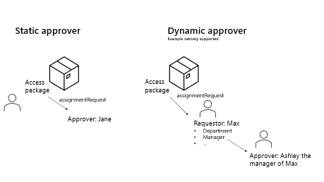 In entitlement management, approvers for access package requests can either be directly assigned, or determined dynamically. Entitlement management natively supports dynamically determining approvers such as the requestors manager, their second-level manager, or a sponsor from a connected organization: