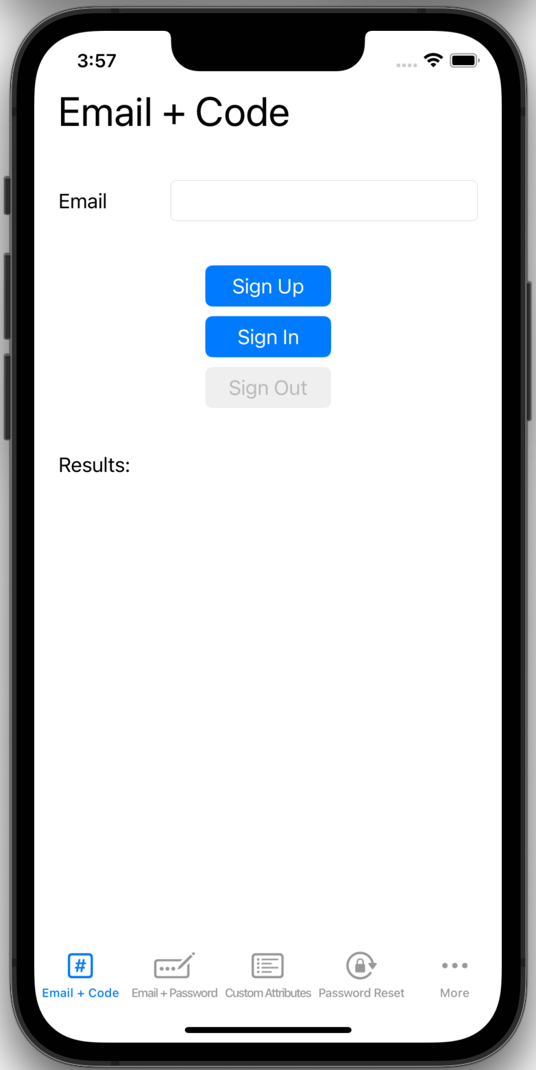 This guide tests Email one-time-passcode usage. Enter a valid email address, select Sign Up, and launch the submit code screen: