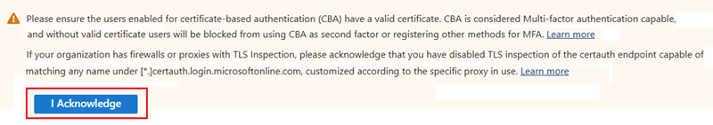 If your organization has firewalls or proxies that use TLS inspection, acknowledge that you turned off TLS inspection of the CA endpoint that is capable of matching any name under [*.]certauth.login.microsoftonline.com, customized according to the specific proxy in use.