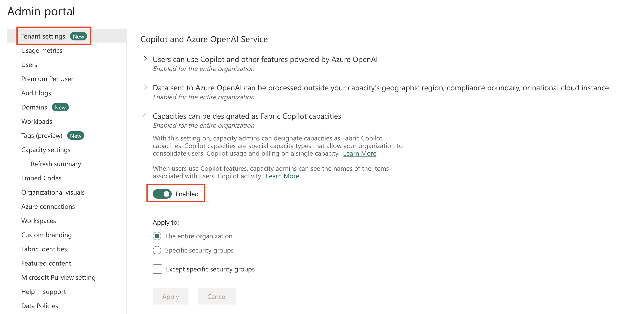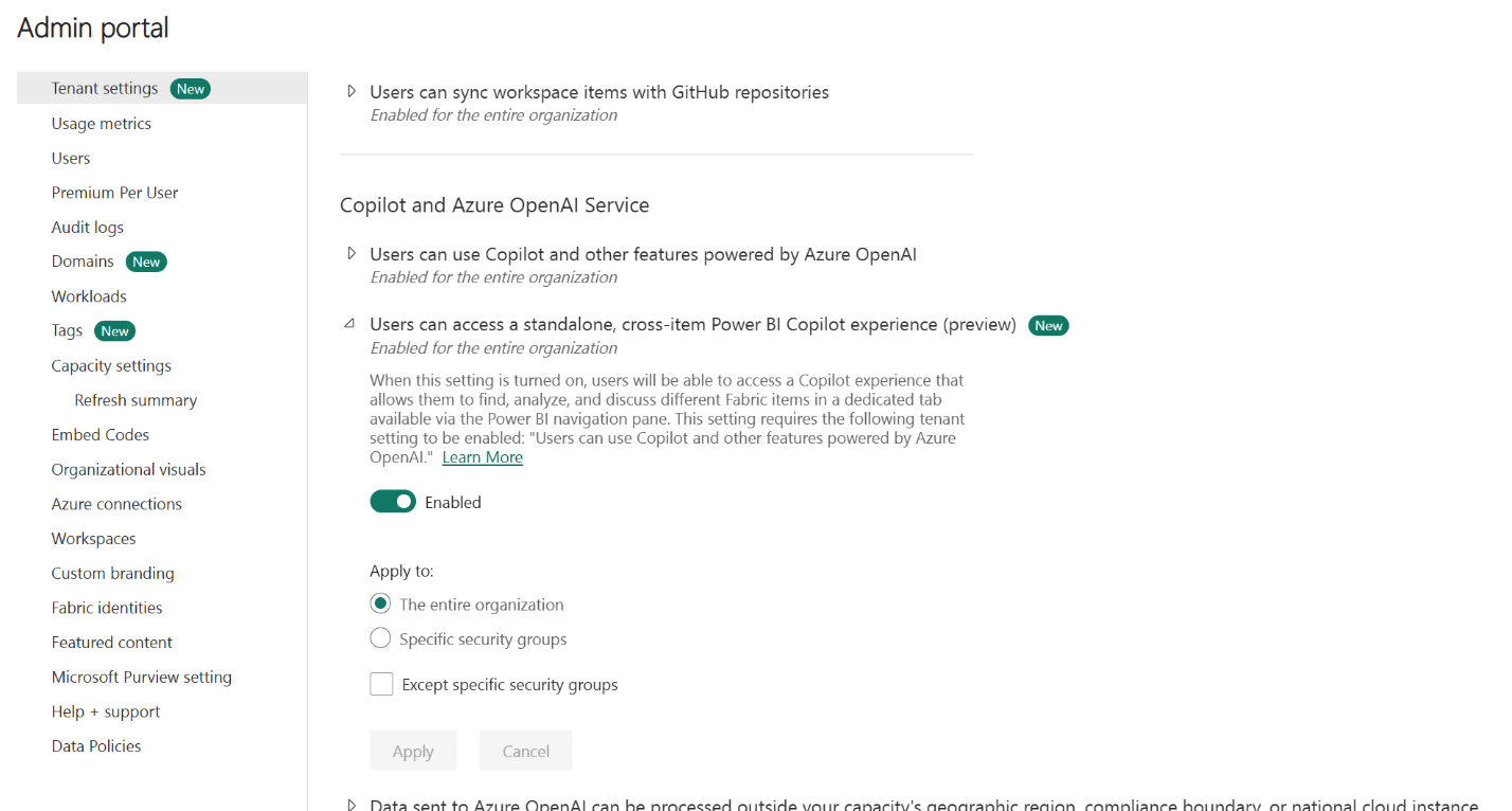 You can enable copilot as a standalone experience for Fabric. Enabling this setting allows users to access the standalone Copilot experience from the left navigation. The Azure OpenAI setting must be enabled at the tenant level to use the standalone experience. This setting also affects the Power BI agent. Turn on this setting to enable the Power BI agent in Microsoft 365. To learn more, see standalone Copilot experience.