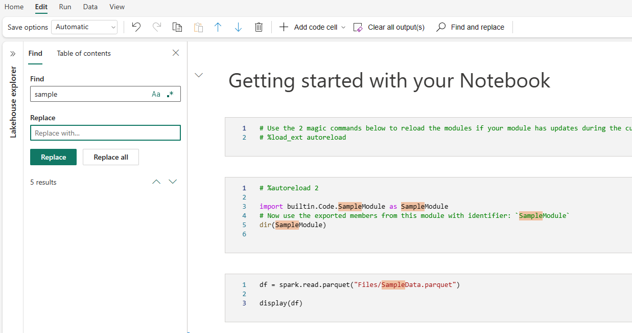 Fabric notebooks provide code snippets that help you easily write commonly used code patterns, like: