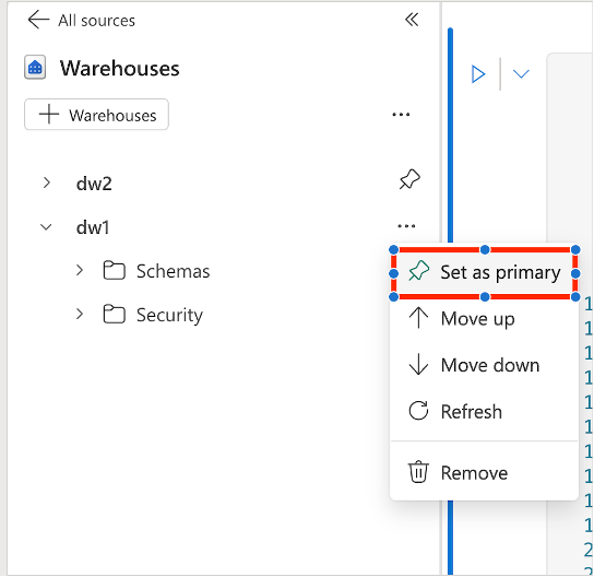 You can add multiple warehouses or SQL analytics endpoints into the notebook, with one of them is set as the primary. The primary warehouse runs the T-SQL code. To set it, go to the object explorer, select ... next to the warehouse, and choose Set as primary.