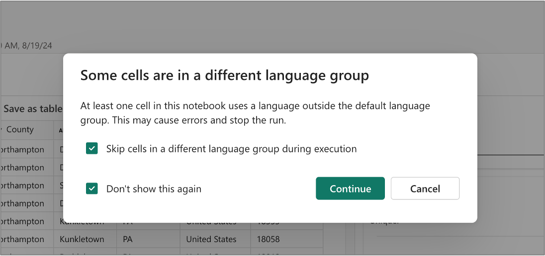 Within the same notebook, it's possible to create code cells that use different languages. For instance, a PySpark code cell can precede a T-SQL code cell. In such case, user can choose to skip the run of any PySpark code for T-SQL notebook. This dialog appears when you run all the code cells by clicking the Run all button in the toolbar.
