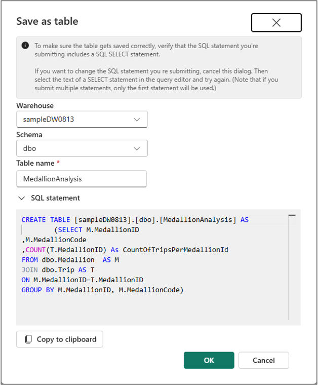 You can use Save as table menu to save the results of the query into the table using CTAS command. To use this menu, select the query text from the code cell and select Save as table menu.
