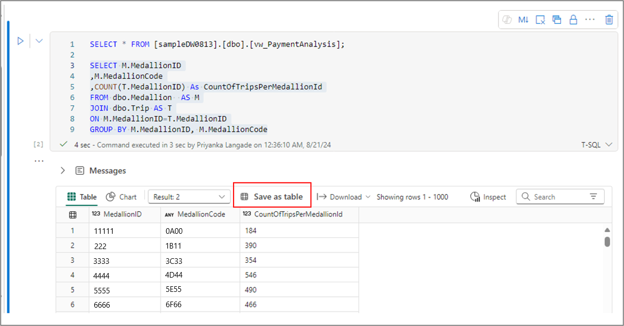 Most of the existing notebook functionalities are available for T-SQL notebooks. These include charting query results, coauthoring notebooks, scheduling regular executions, and triggering execution within Data Integration pipelines.