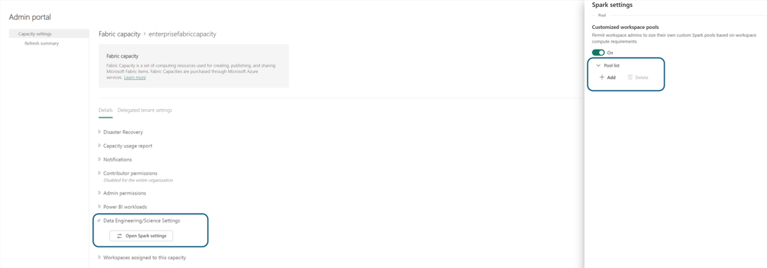In the Pool List section of Spark Settings, click Add to create a Custom Pool for your Fabric Capacity.