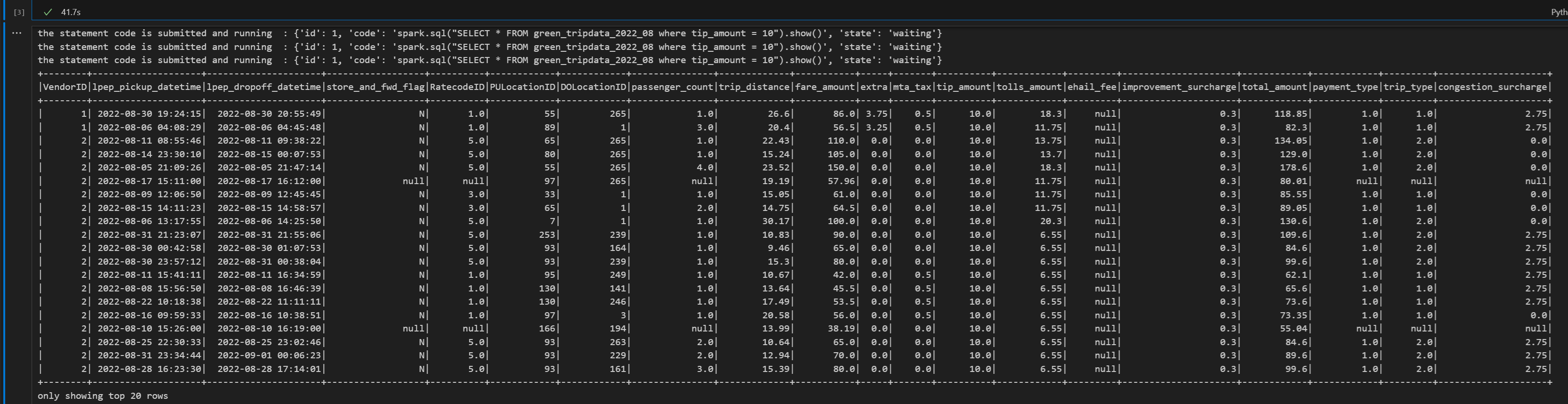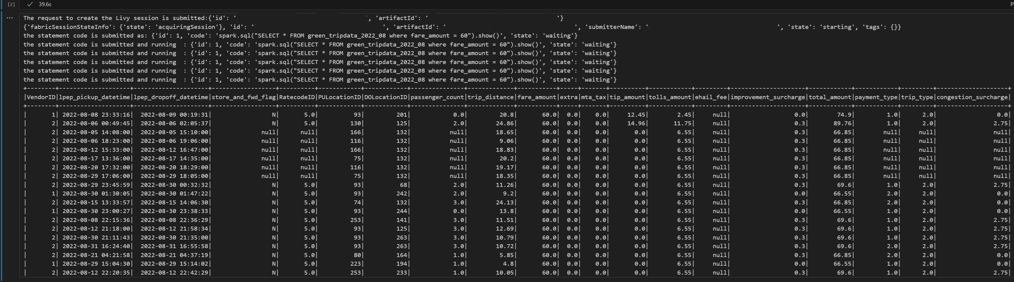 # call get session API import time table_name = "green_tripdata_2022" print("Checking session status...") # Get current session status get_session_response = requests.get(livy_session_url, headers=headers) session_status = get_session_response.json() print(f"Current session state: {session_status['state']}") # Wait for session to become idle (ready to accept statements) print("Waiting for session to become idle...") while session_status["state"] != "idle": print(f" Session state: {session_status['state']} - waiting 5 seconds...") time.sleep(5) get_session_response = requests.get(livy_session_url, headers=headers) session_status = get_session_response.json() print("Session is now idle and ready to accept statements") # Execute a Spark SQL statement execute_statement_url = f"{livy_session_url}/statements" # Define your Spark SQL query - Replace with your actual table and query payload_data = { "code": "spark.sql(\"SELECT * FROM {table_name} WHERE column_name = 'some_value' LIMIT 10\").show()", "kind": "spark" # Type of code (spark, pyspark, sql, etc.) } print("Submitting Spark SQL statement...") print(f"Query: {payload_data['code']}") try: # Submit the statement for execution execute_statement_response = requests.post(execute_statement_url, headers=headers, json=payload_data) if execute_statement_response.status_code == 200: statement_info = execute_statement_response.json() print('Statement submitted successfully') print(f"Statement Info: {json.dumps(statement_info, indent=2)}") # Get statement ID for monitoring statement_id = str(statement_info['id']) get_statement_url = f"{livy_session_url}/statements/{statement_id}" print(f"Statement ID: {statement_id}") # Monitor statement execution print("Monitoring statement execution...") get_statement_response = requests.get(get_statement_url, headers=headers) statement_status = get_statement_response.json() while statement_status["state"] != "available": print(f" Statement state: {statement_status['state']} - waiting 5 seconds...") time.sleep(5) get_statement_response = requests.get(get_statement_url, headers=headers) statement_status = get_statement_response.json() # Retrieve and display results print("Statement execution completed!") if 'output' in statement_status and 'data' in statement_status['output']: results = statement_status['output']['data']['text/plain'] print("Query Results:") print(results) else: print("No output data available") else: print(f"Failed to submit statement. Status code: {execute_statement_response.status_code}") print(f"Response: {execute_statement_response.text}") except Exception as e: print(f"Error executing statement: {e}")Run the notebook cell, you should see several incremental lines printed as the job is submitted and the results returned.