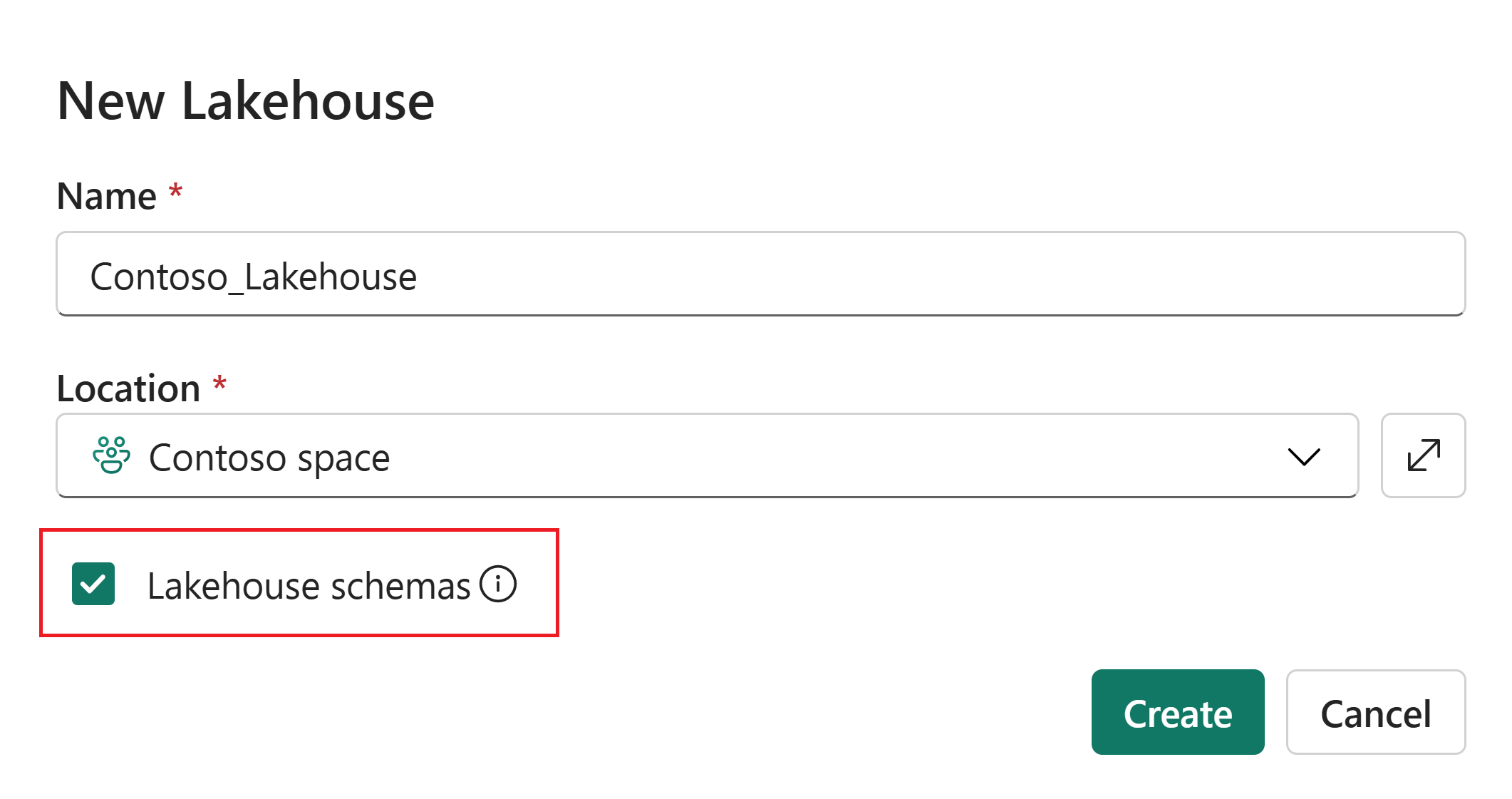 To enable schema support for your lakehouse, check the box next to Lakehouse schemas when you create it.