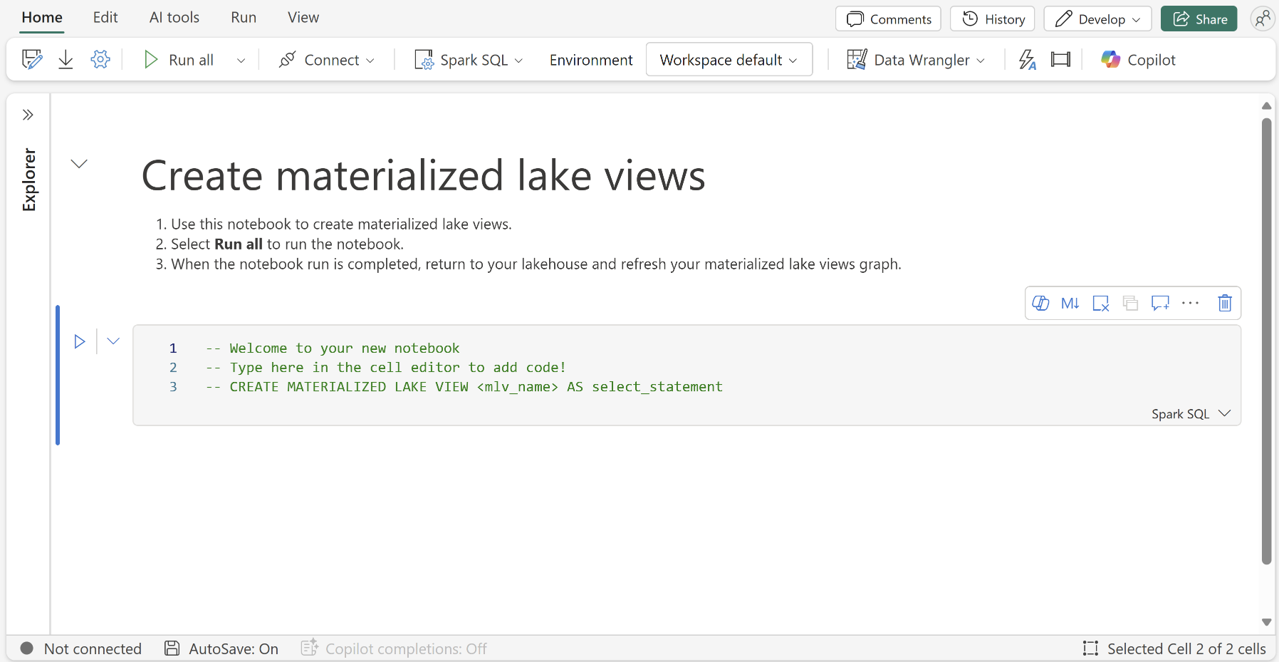 productsandorders. Run the following commands in the notebook:CREATE SCHEMA IF NOT EXISTS bronze; CREATE TABLE IF NOT EXISTS bronze.products ( product_id INT, product_name STRING, price DOUBLE ); INSERT INTO bronze.products VALUES (101, 'Laptop', 1200.50), (102, 'Smartphone', 699.99), (103, 'Tablet', 450.00);CREATE TABLE IF NOT EXISTS bronze.orders ( order_id INT, product_id INT, quantity INT, order_date DATE ); INSERT INTO bronze.orders VALUES (1001, 101, 2, '2025-06-01'), (1002, 103, 1, '2025-06-02'), (1003, 102, 3, '2025-06-03');Create materialized lake views by using the source tables. Run the following commands in the notebook: