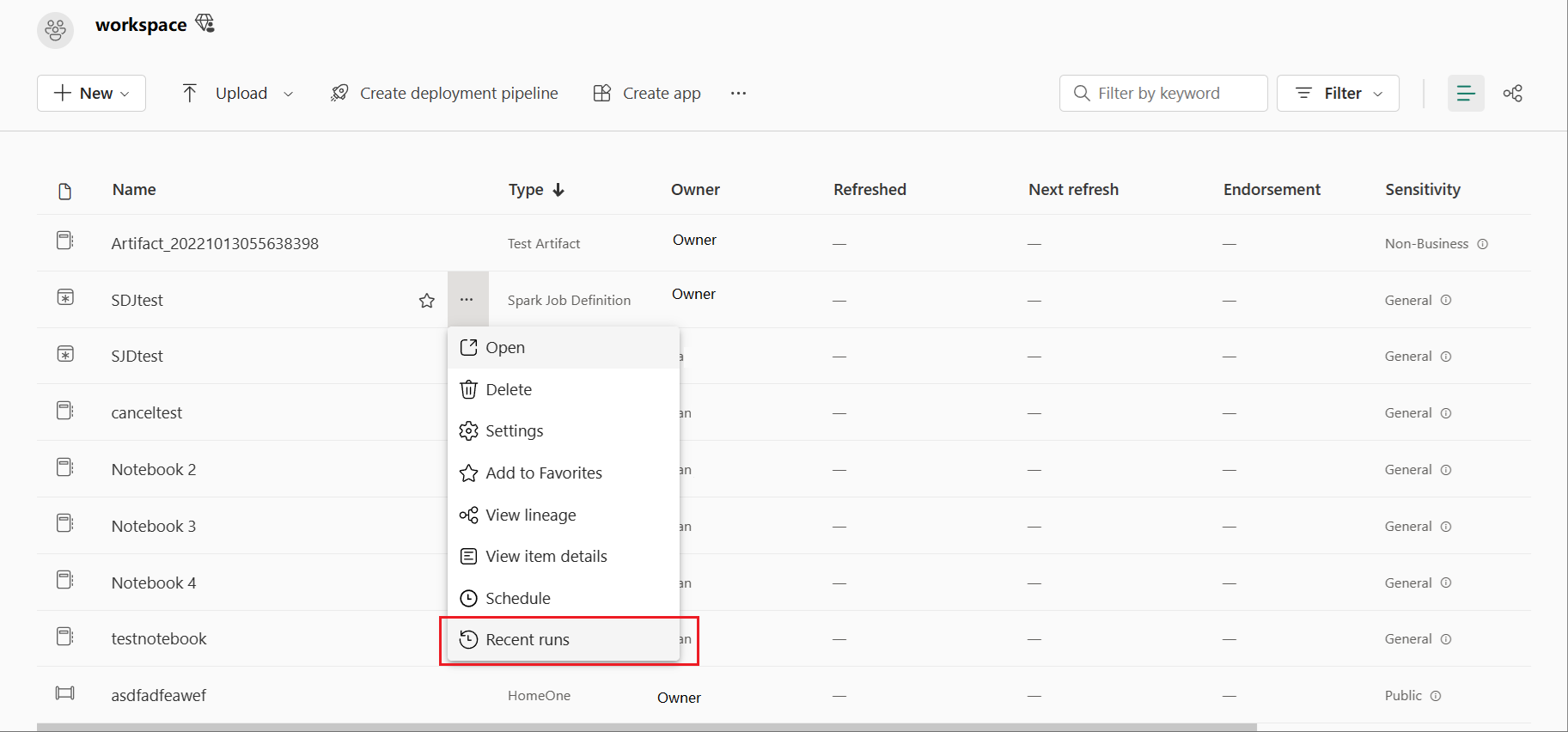 You can access the job runs associated with specific Spark job definition items by using the Recent runs contextual menu on the workspace homepage.