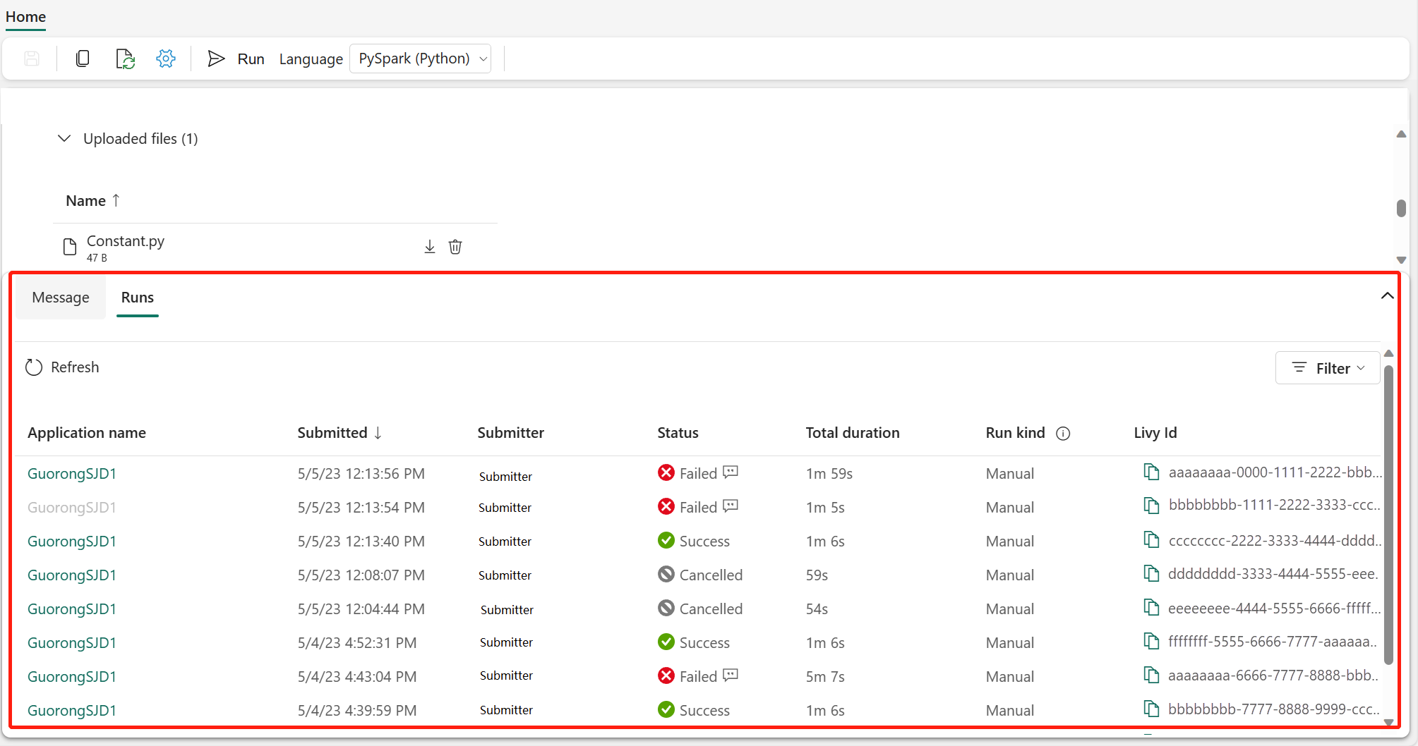 The Spark job definition inline monitoring feature allows you to view Spark job definition submission and run status in real-time. You can also view the Spark job definition's past runs and configurations and navigate to the Spark application detail page to view more details.
